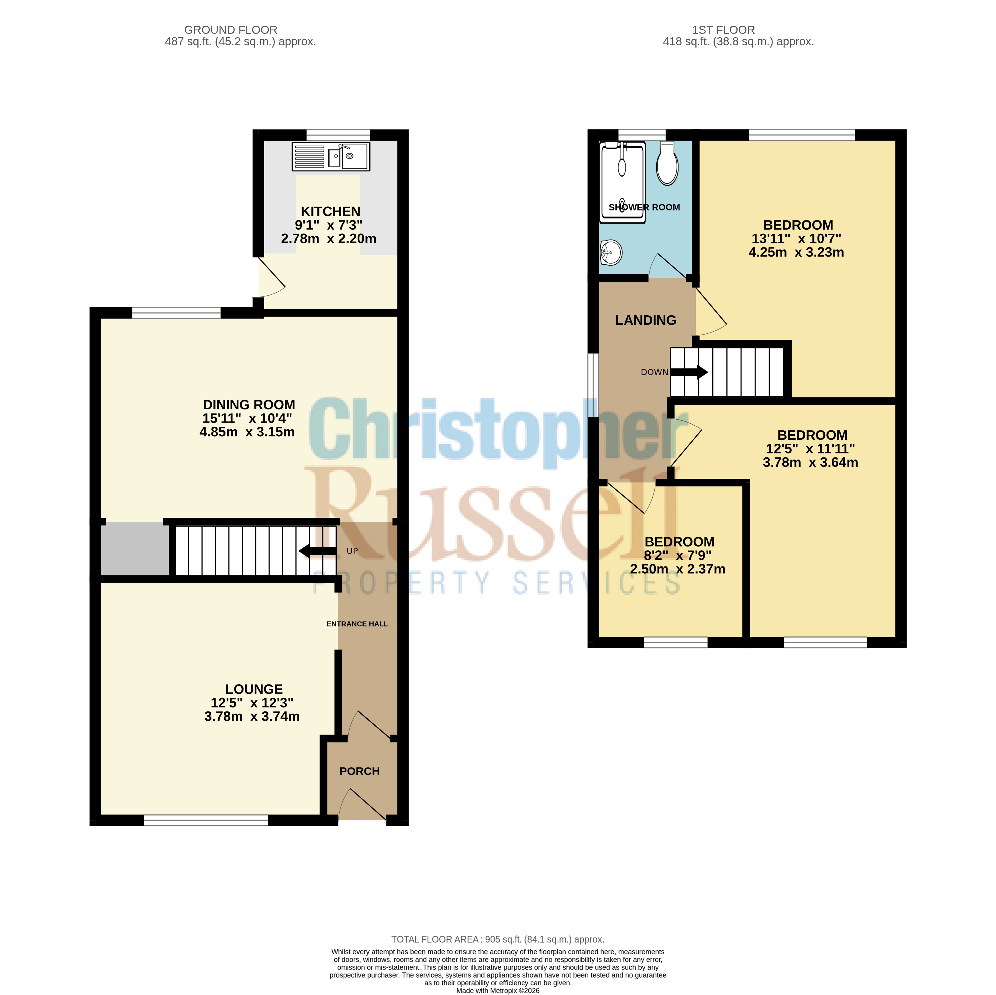 The accommodation comprises an entrance hall, lounge, dining room, and kitchen on the ground floor, with three bedrooms and a family bathroom on the first floor.