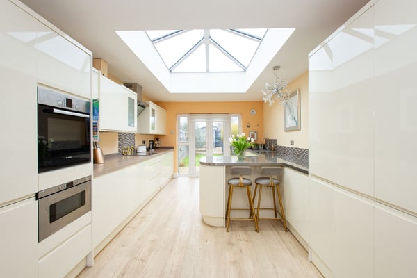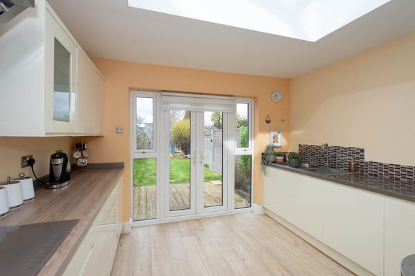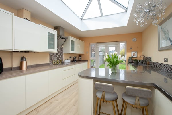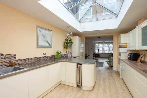 The ground floor features a through lounge, and a spacious open-plan kitchen and dining area, complete with a central breakfast bar and integrated appliances. The rear extension provides generous additional living space and benefits from underfloor heating throughout.