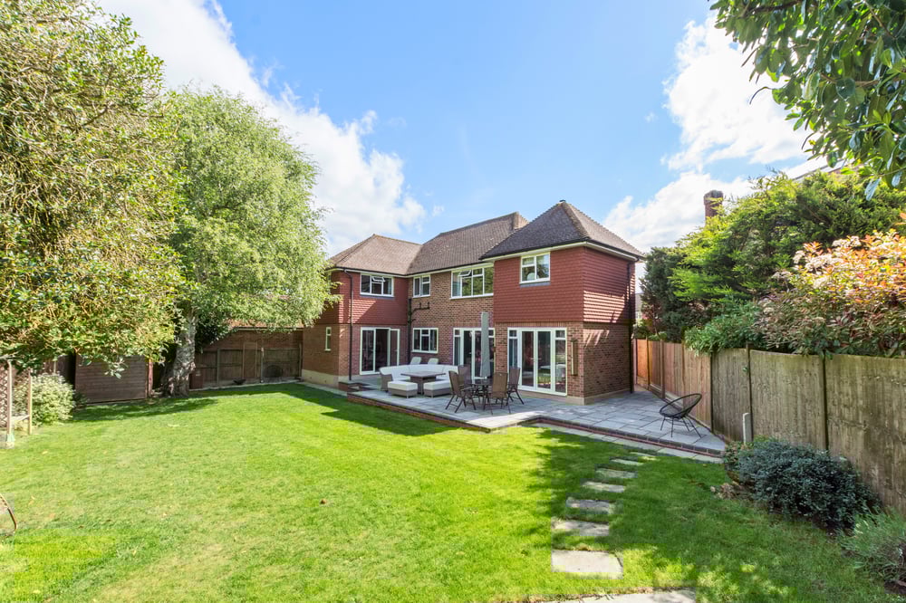 The rear garden is a particular feature — thoughtfully landscaped with mature planting, paved terraces for dining, and a charming summerhouse.